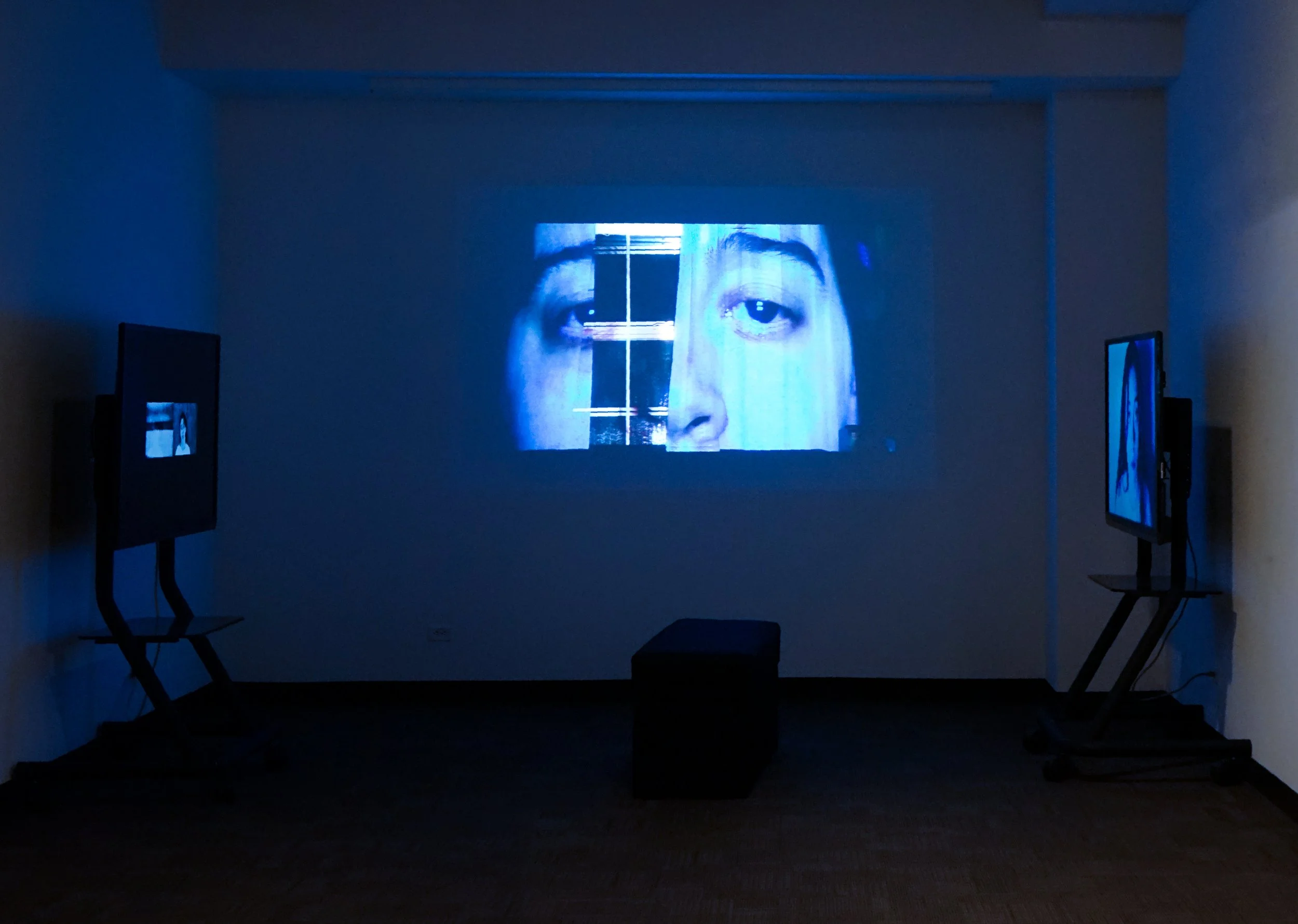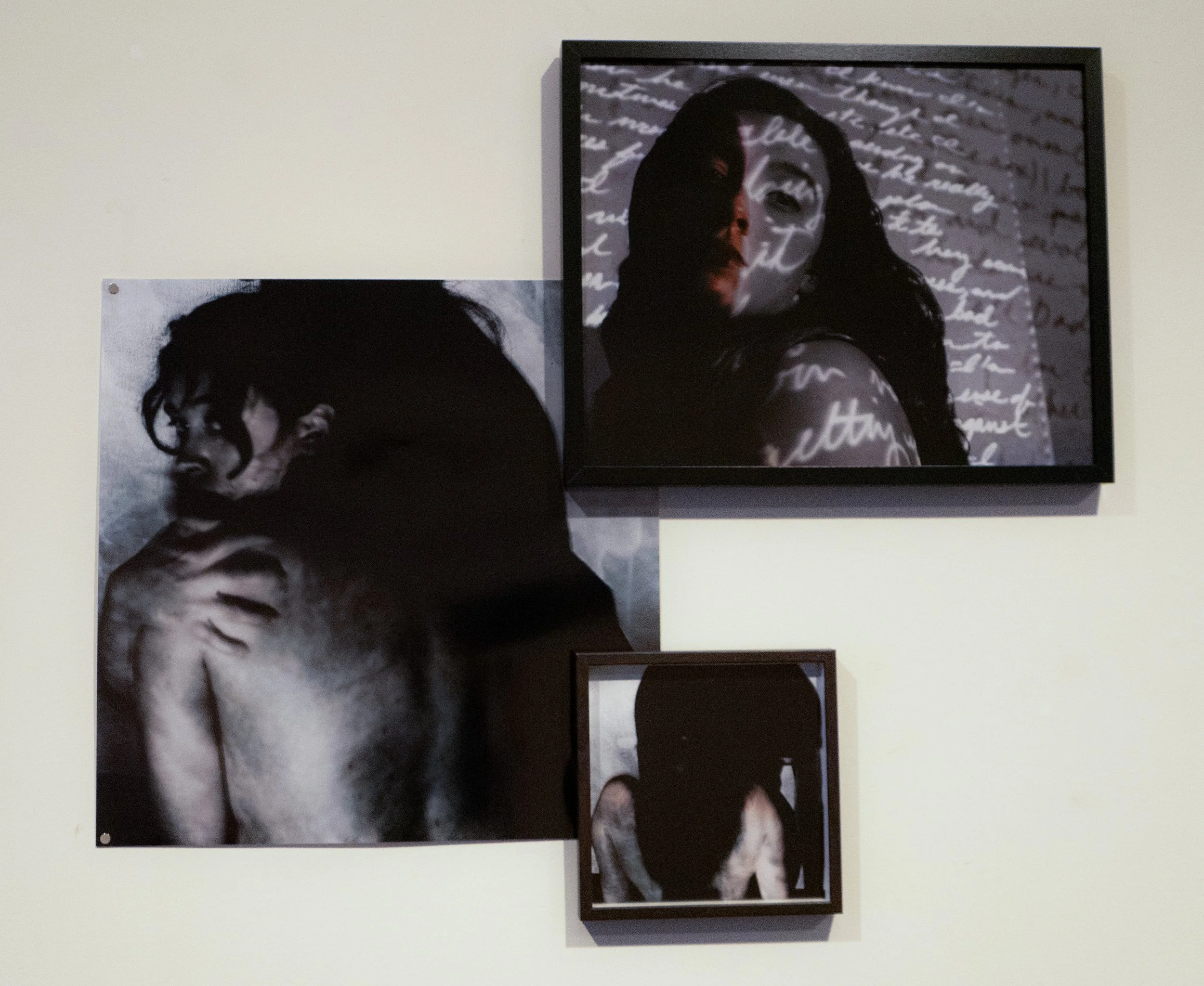 Installation View of Shadow Exposures, 2023. Far left: Untitled Reflection, center: Looming Burden, top right: Am I enough?, bottom right: Shadow Disfigurement. Photo courtesy of Maleah Miller.