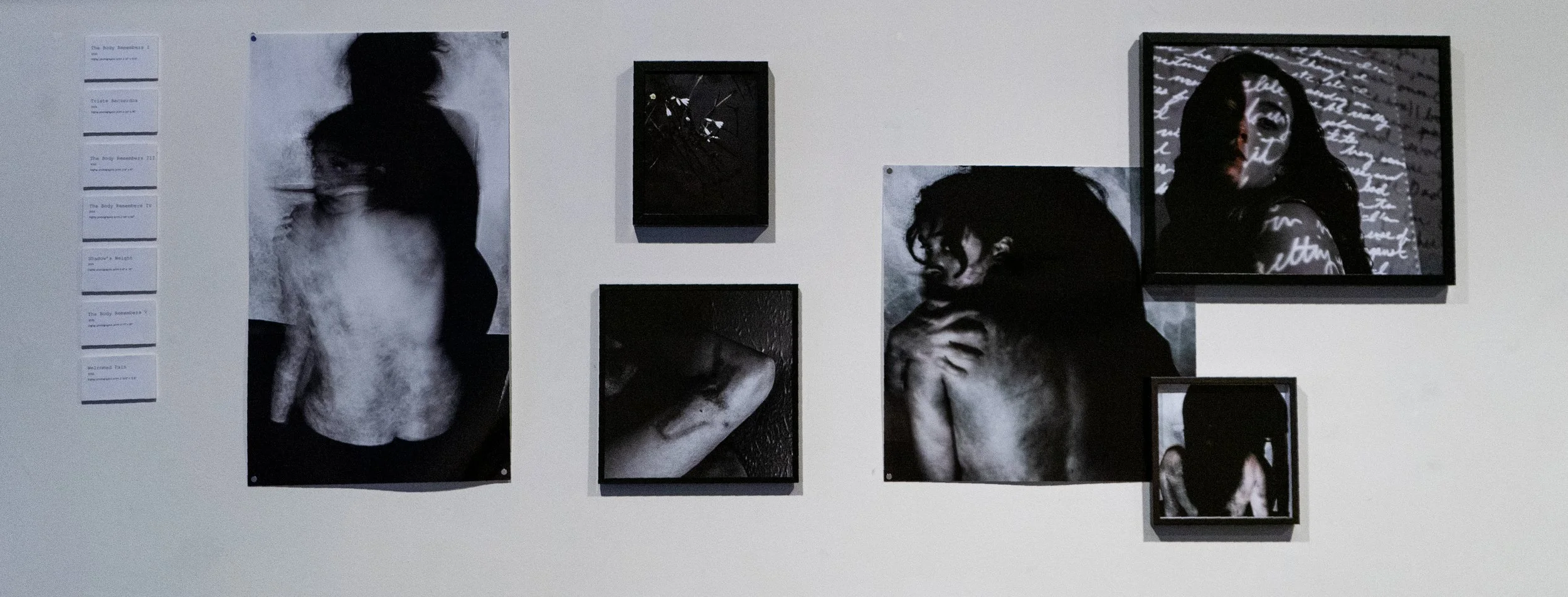 Installation View of Shadow Exposures, 2023. far left: The Body Remembers V, Triste Recuerdos, bottom left: The Body Remembers III